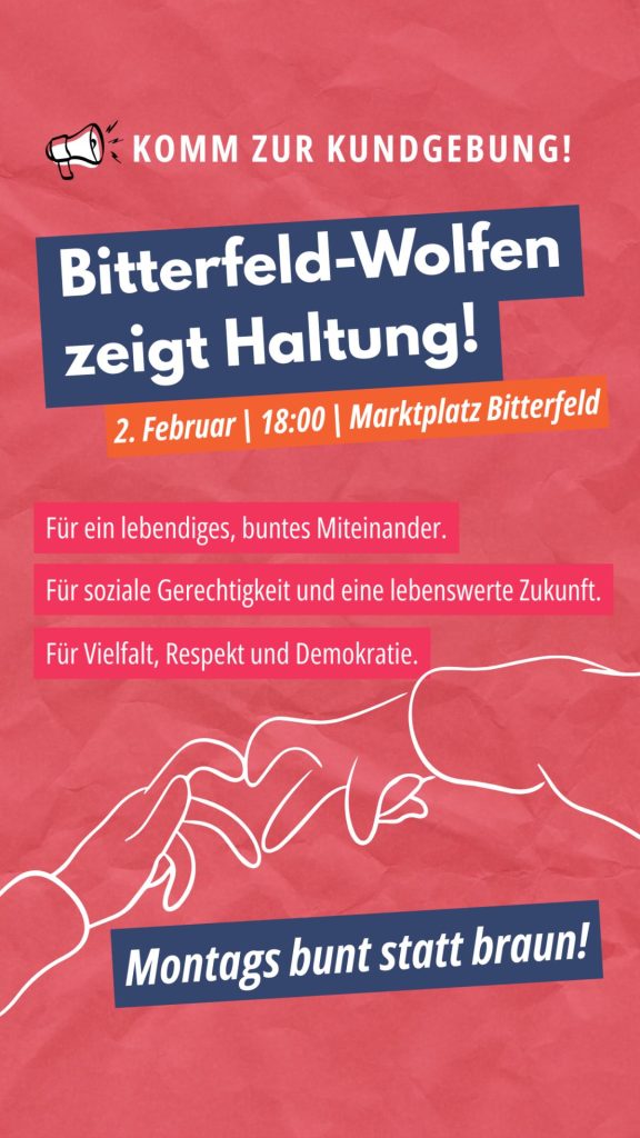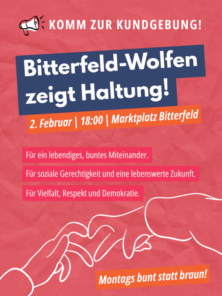 Jeden ersten Montag im Monat gehen wir in Bitterfeld-Wolfen gemeinsam auf die Straße. Gegen Hass und Hetze. Für Demokratie und Solidarität.